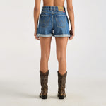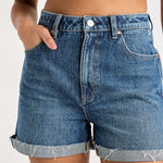Our Hi Bells Short is a high rise, slim fit. Designed with a fitted top block, and A-line through the leg. Made in a mid blue wash with a raw edge, rolled hem.