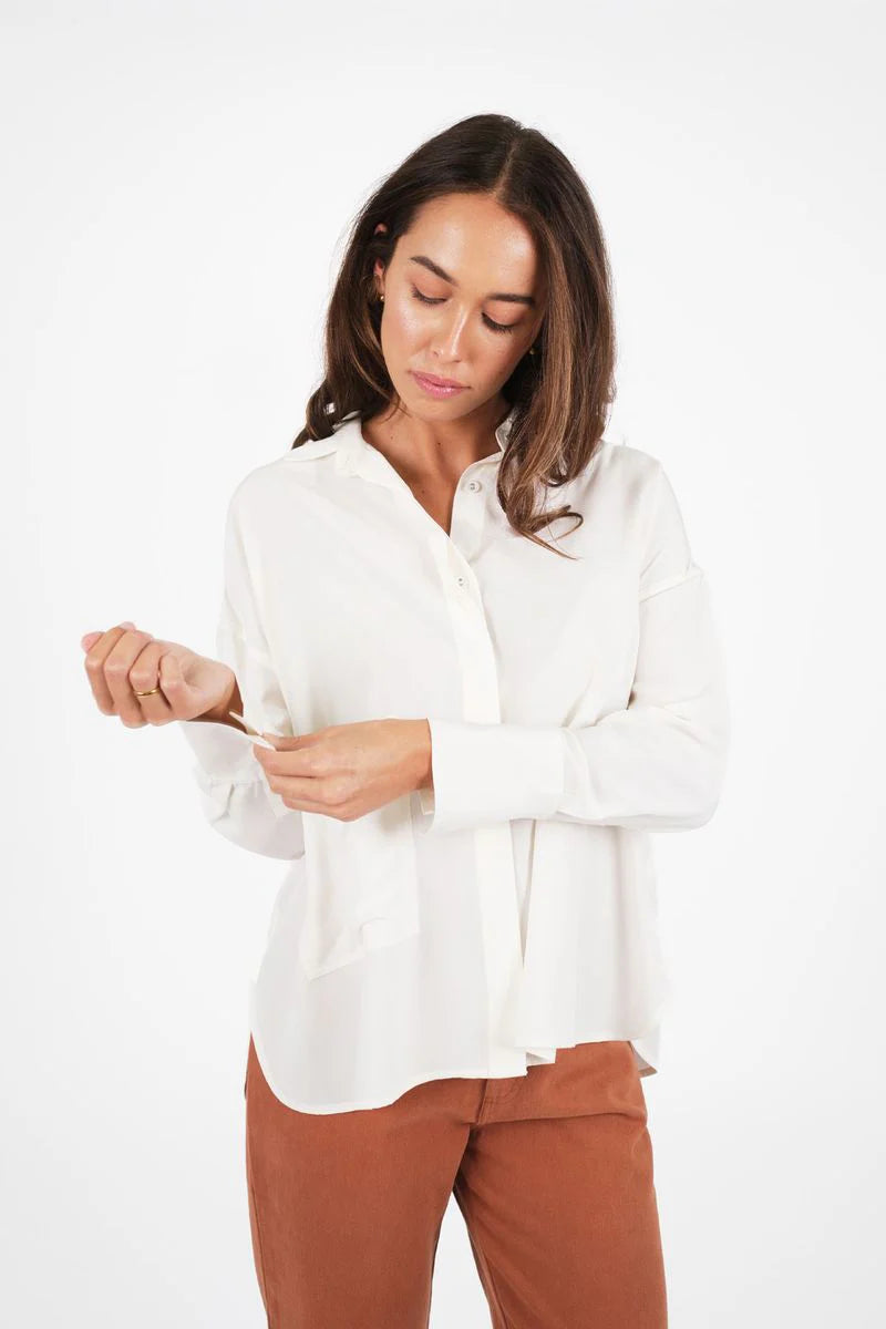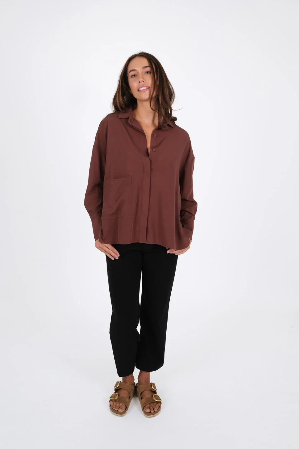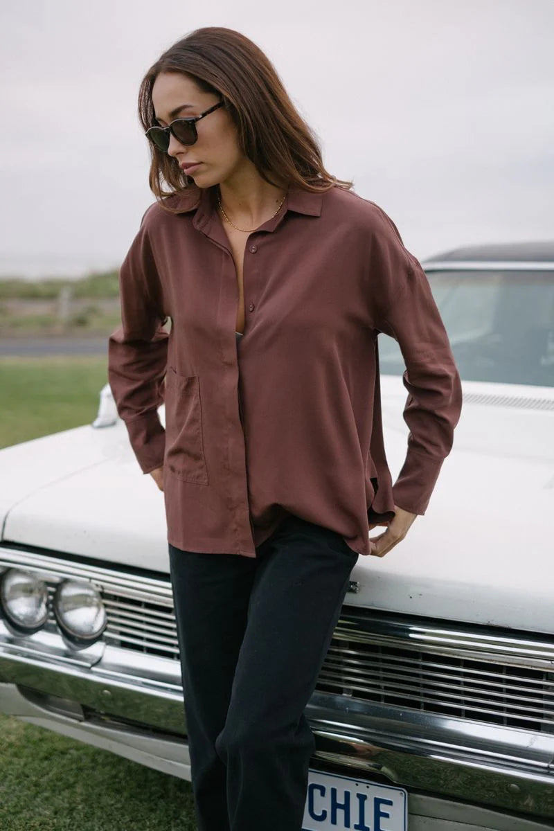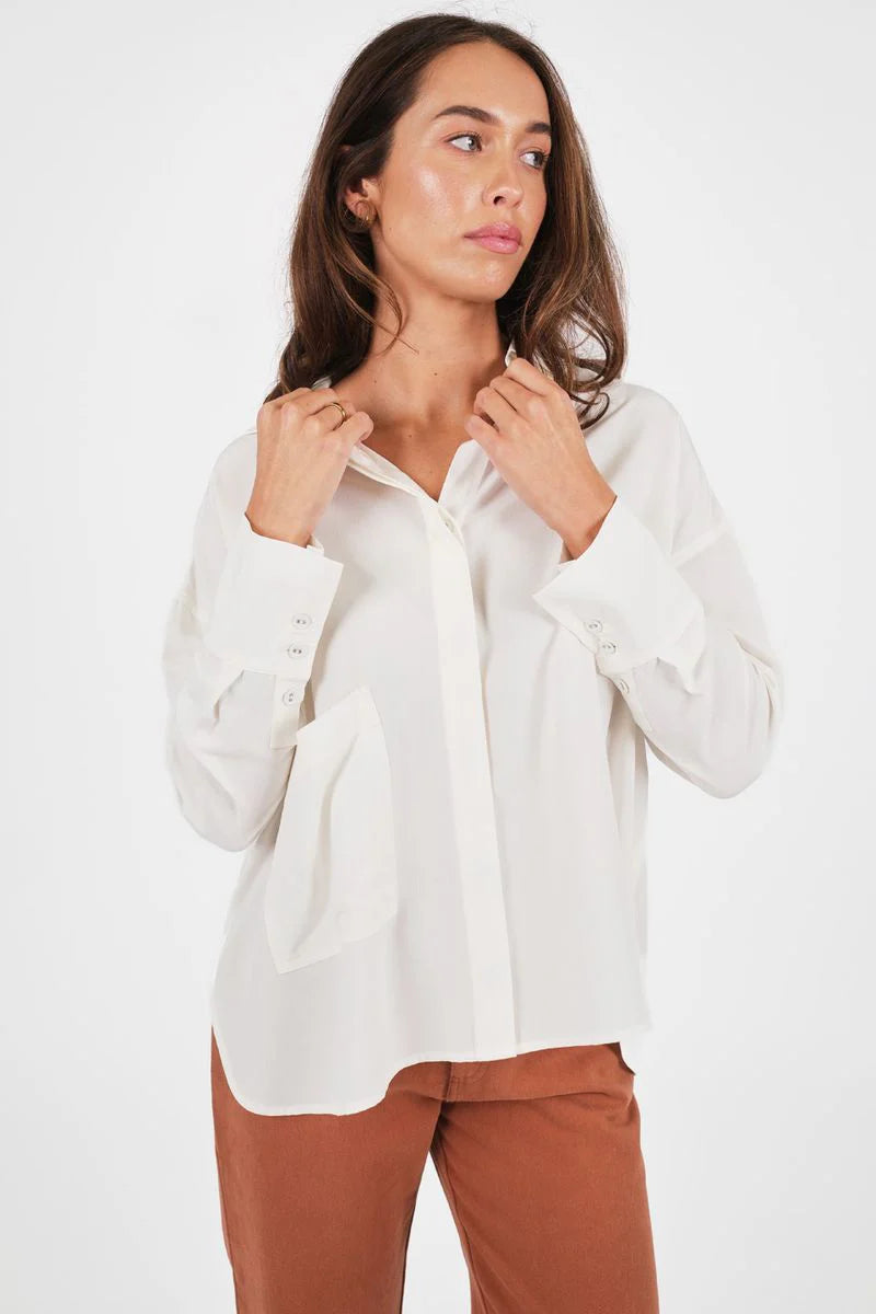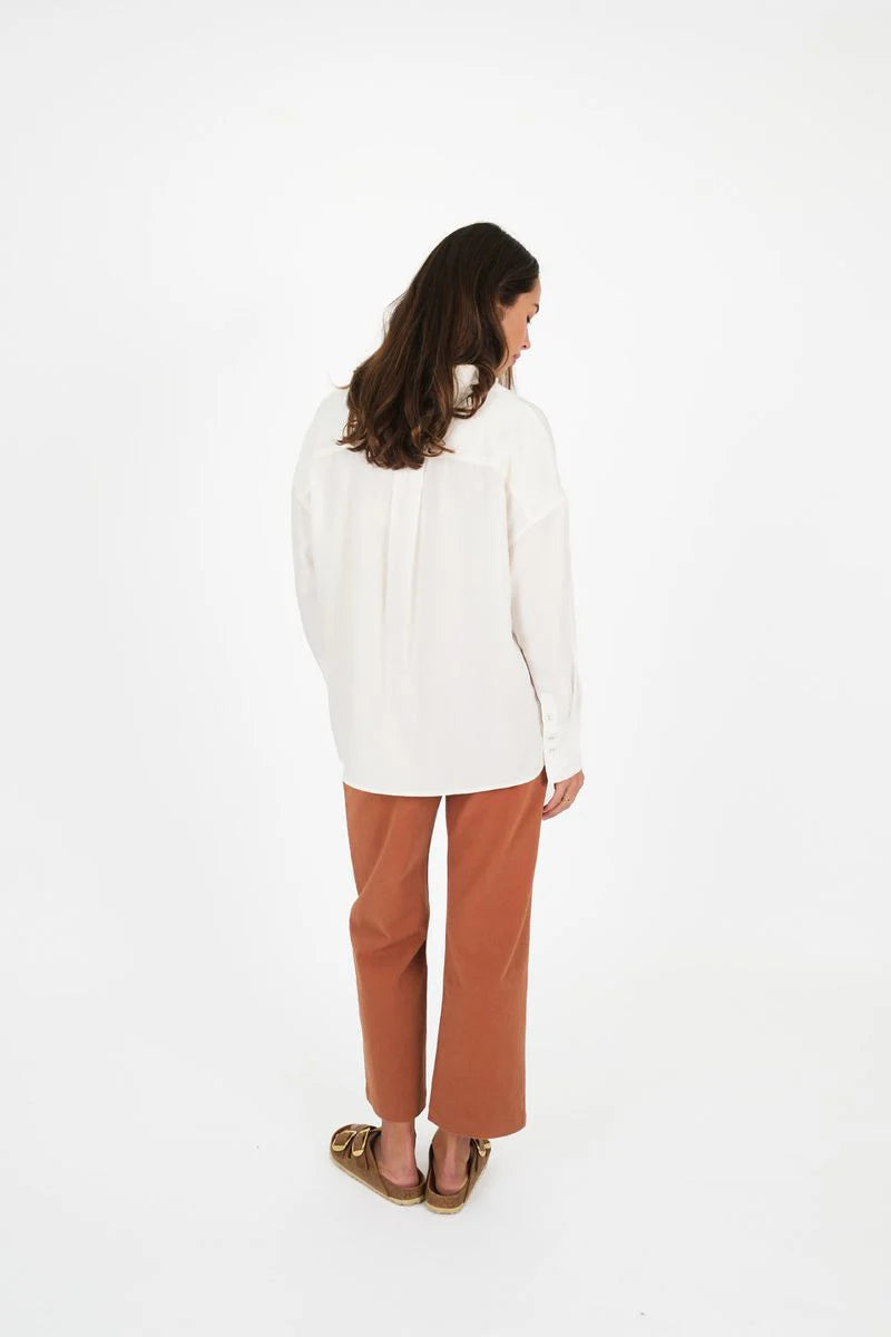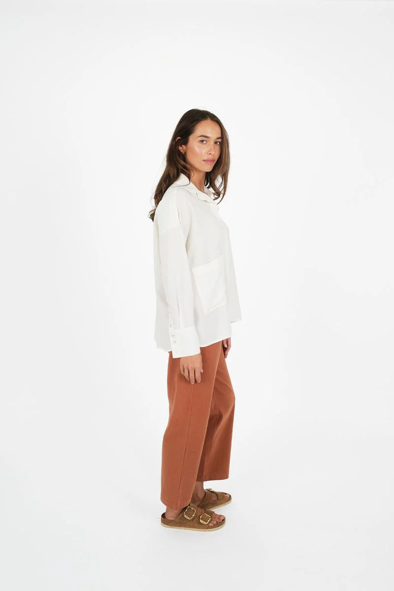 Meet the Boxy Shirt- made from natural fibres. She’s light, lovely and offers an oversized, relaxed fit. Designed with an oversized pocket for all your essentials and cute sleeve cuffs that can be folded back. You ‘ll find yourself reaching for her again and again, because she looks great worn with or without a tuck over our Rocky Pants. Boxy is made from a super soft cotton blend with loads of drape due to the 30% Tencel (an environmentally better choice yarn). The cute, curved shirt-tail hem offers booty coverage and there are two fab colours on offer.
