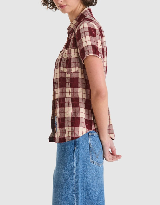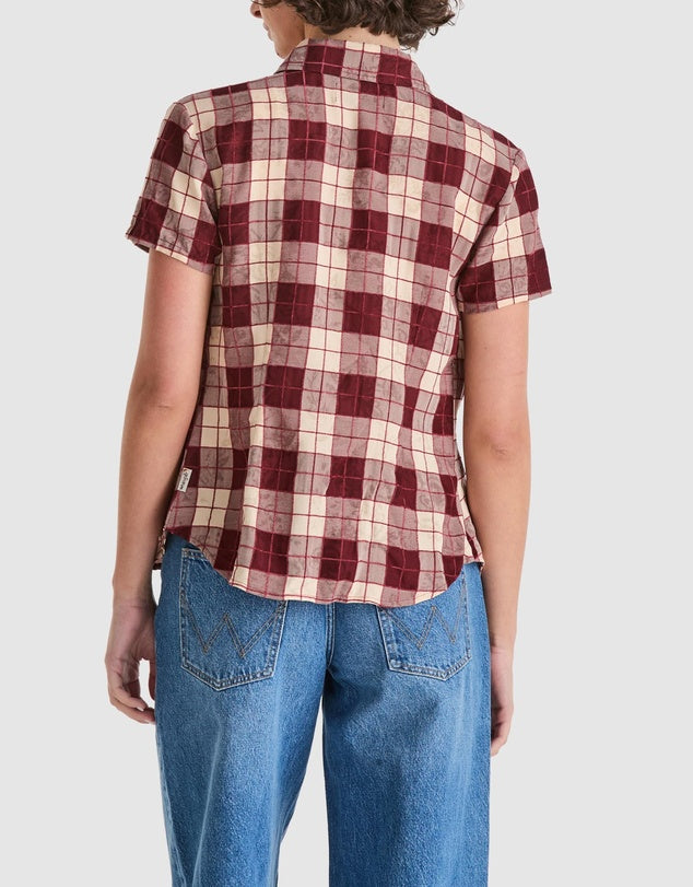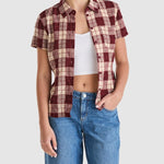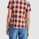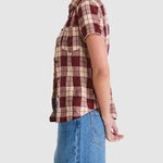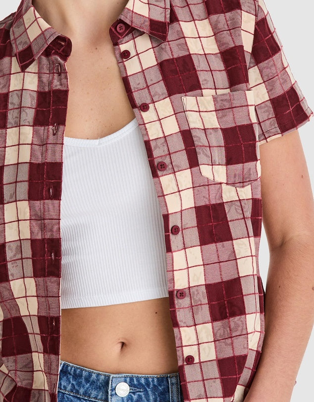 -Lightweight fabric- Collared neck- Short sleeves- Button-up front- Chest patch pocket- Check print
