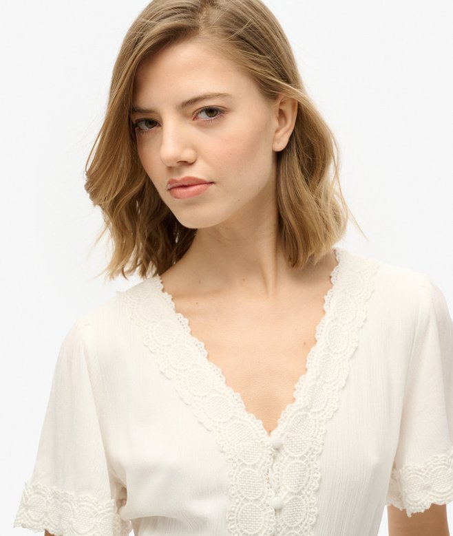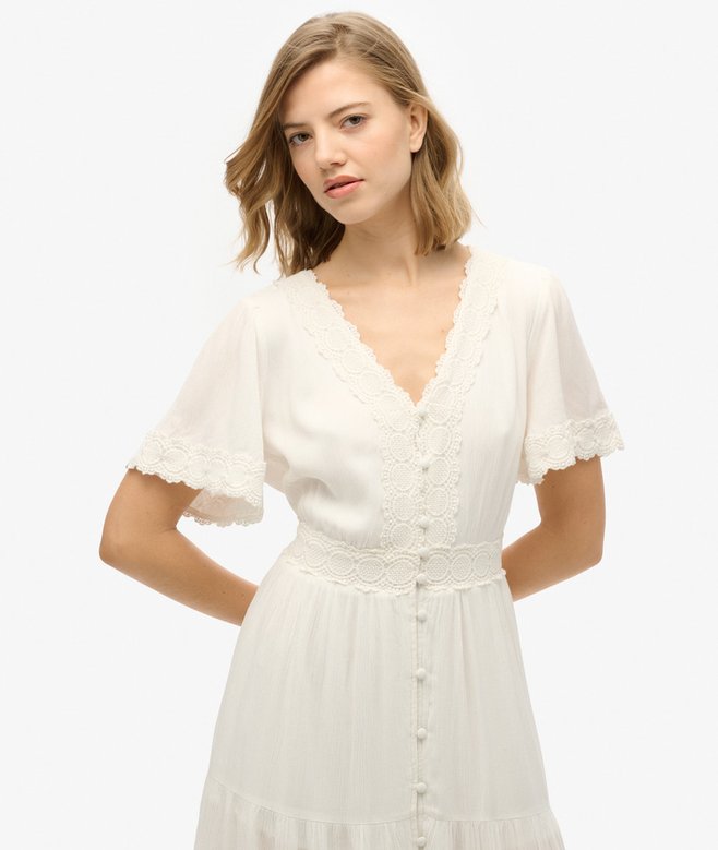 The Ibiza Short Sleeve Midi Tea Dress is here to turn heads and elevate your style to another level. We've crafted it with an airy woven crinkle material and intricate lace detailing throughout, so it's perfect for hot summer days when you need that light layer without compromising on your much-loved style.