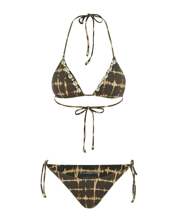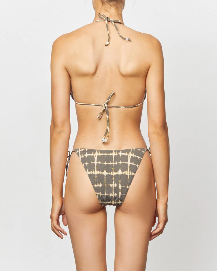 This tie side pant comes straight from the 90's, with a fixed curved waistline, and strings that tie high on the hip, alluding to longer leaner legs. Featuring our earthy toned tie-dye pattern, Rip Tide with luminous ivory pearl style beads on the ties.