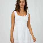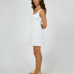 The Dusty Mini Dress is a fresh, romantic piece in crisp white, detailed with delicate lace trim at the waist, hem, neckline, and sleeves. A self-tie front and soft gathers at the waist and hem create a flattering, floaty silhouette. Style it with strappy sandals or ankle boots for an effortlessly feminine spring look.