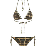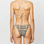 This tie side pant comes straight from the 90's, with a fixed curved waistline, and strings that tie high on the hip, alluding to longer leaner legs. Featuring our earthy toned tie-dye pattern, Rip Tide with luminous ivory pearl style beads on the ties.