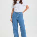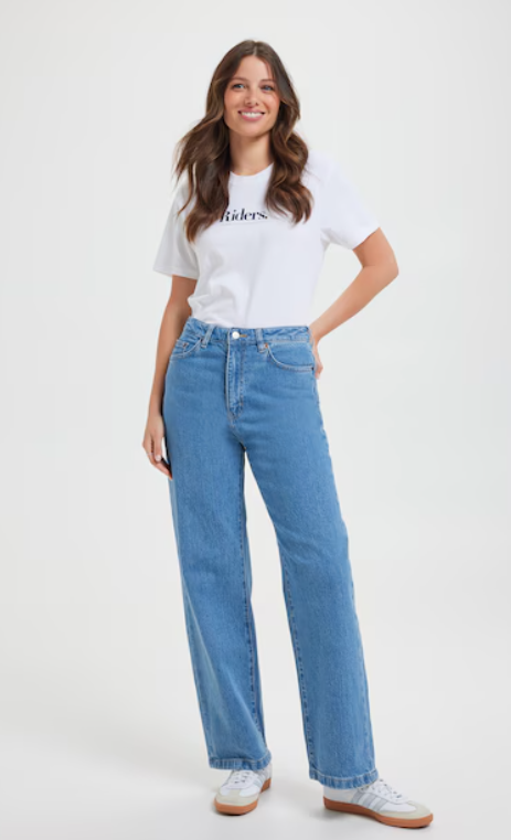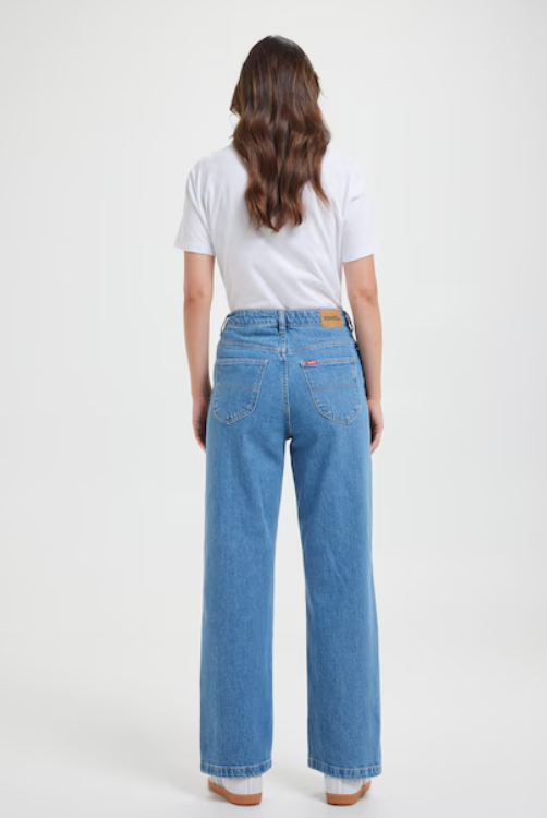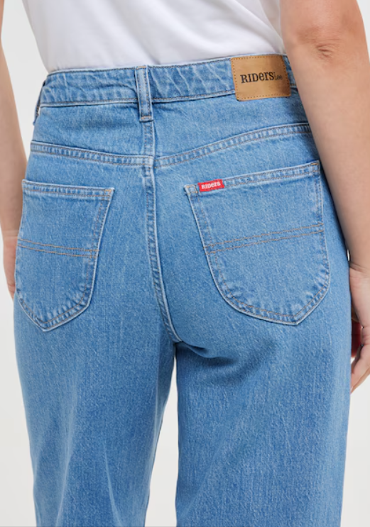 The Riders Hi Wide jean sits high and snug on the waist with a dramatic A-line leg silhouette that flatters and elongates the leg. Constructed in a stretch, soft denim, with an authentic vintage texture that becomes more unique with every wash.