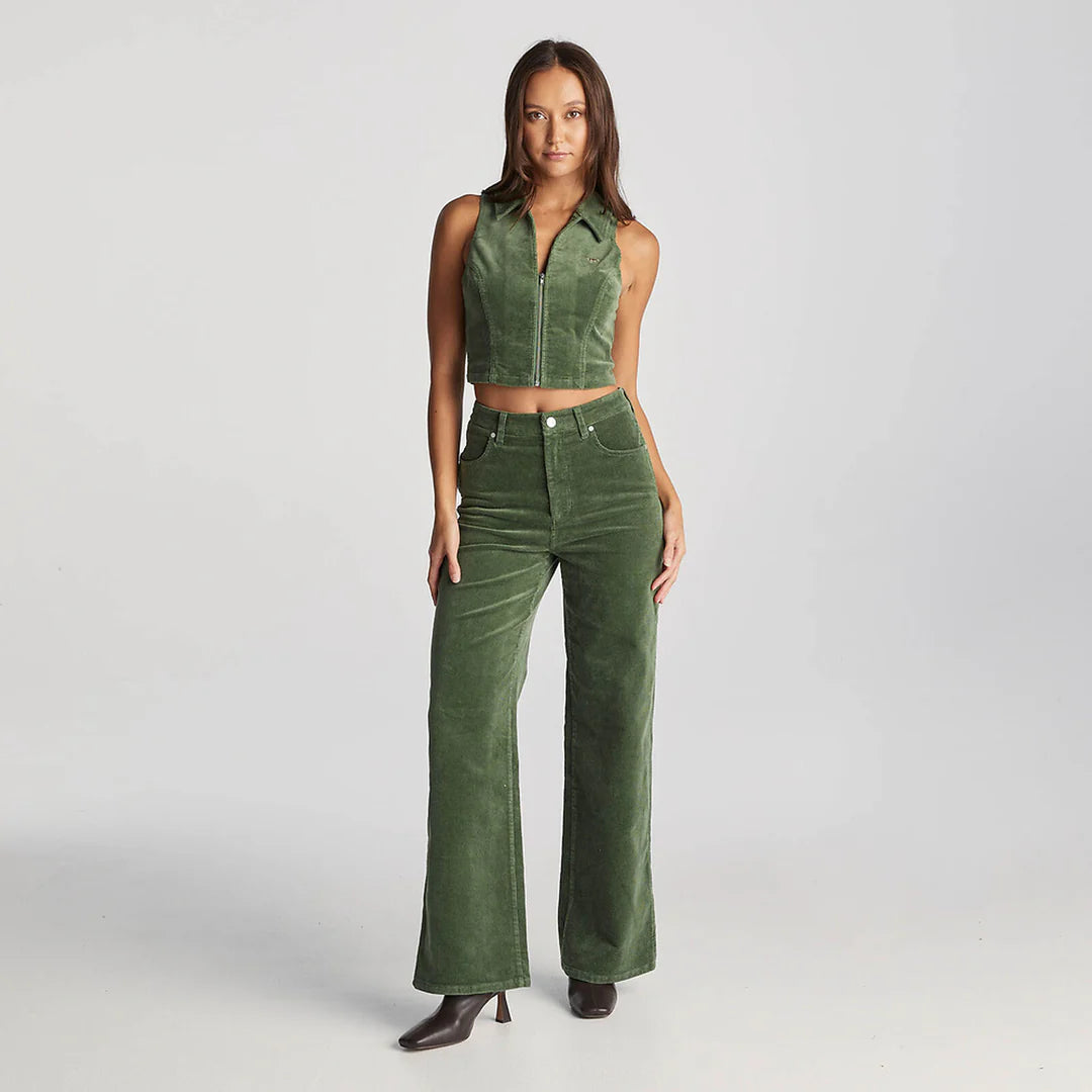 Hi Bells is the heritage inspired wide-flare with a dramatic full length to wear with any shoe. Sitting high and snug on the waist with an iconic wide-flare silhouette. Made in a vintage inspired thyme green.